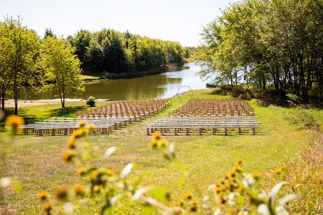 We have two outdoor ceremony options. You can have your ceremony down by the water or up by the venue on the patio! We of course will take care of setting the chairs and benches up for you. If weather plays a role in your day, we will have a plan B and host the ceremony inside the venue.